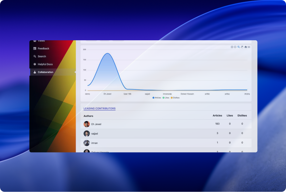 Monitor the contribution activity from your entire team or individual authors who create content. This section tracks the number of Articles, Likes, and Dislikes for each author, highlighting your Leading Contributors and their overall impact.
