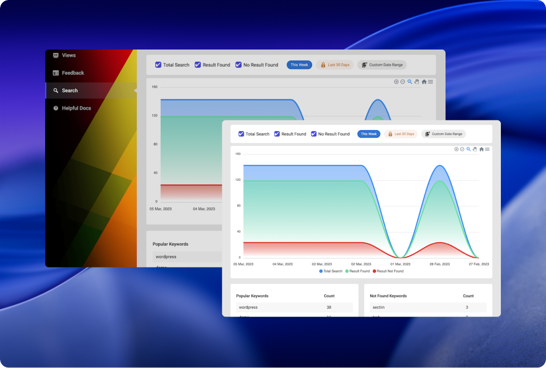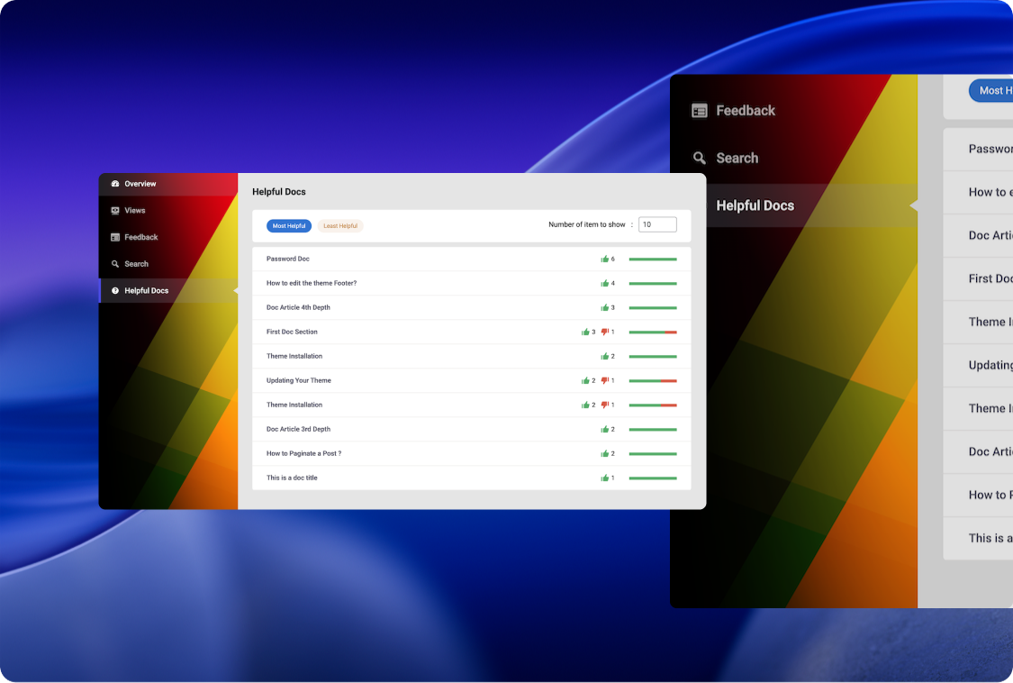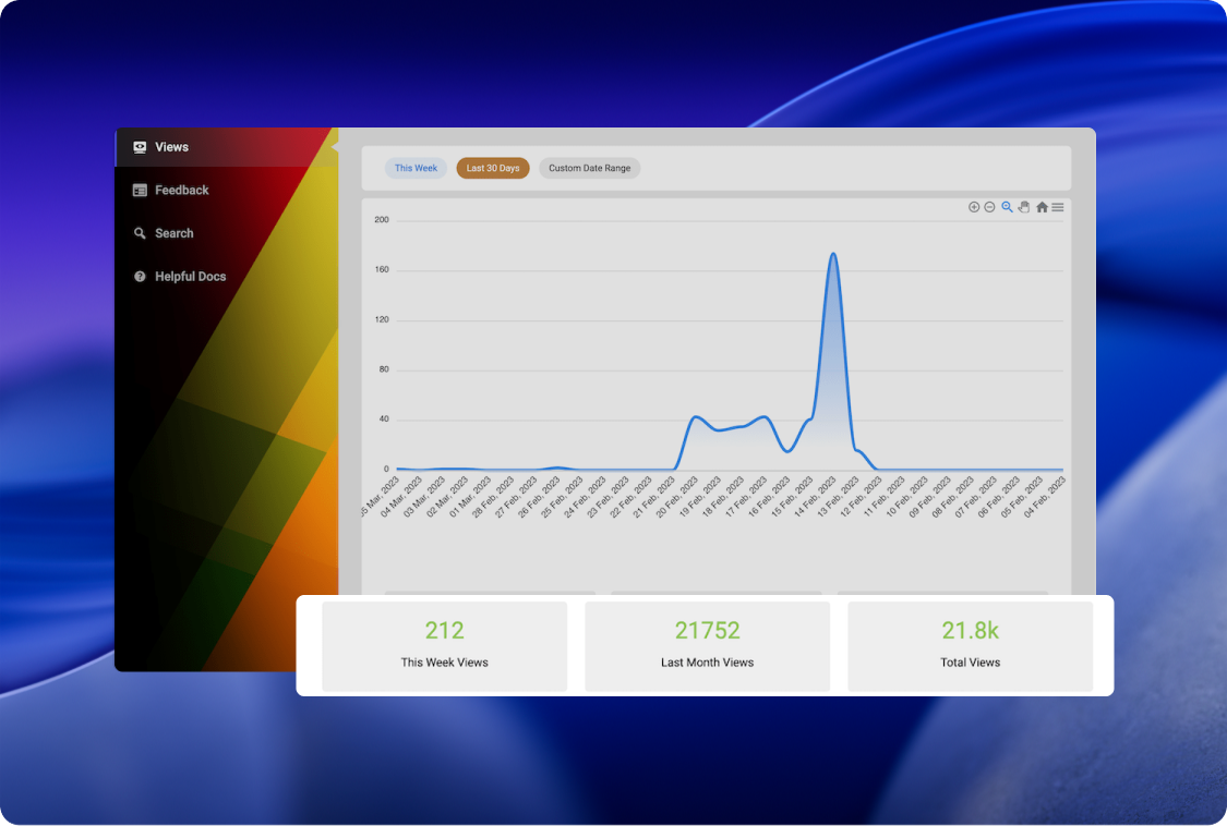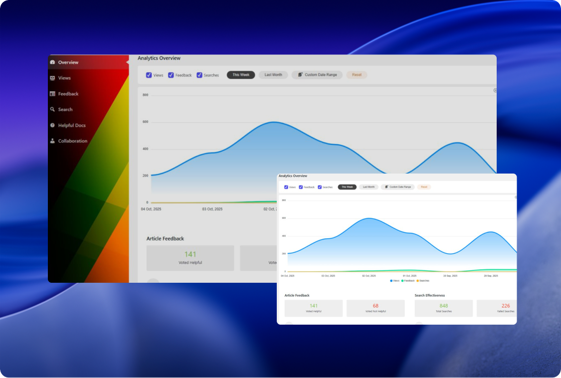 This feature provides deep insights into your documentation’s performance by tracking essential metrics. It monitors article views, user search behavior, positive and negative feedback, and highlights most helpful documents to gauge effectiveness.
