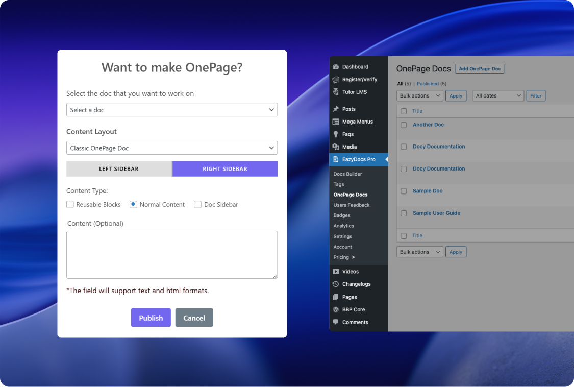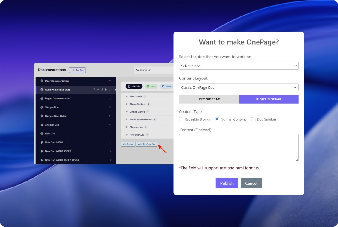 Leverage this simple setup to transform any document into a compact OnePage Doc. Choose your desired layout and content source to create highly focused, easily digestible documentation without navigating complex multi-page structures.